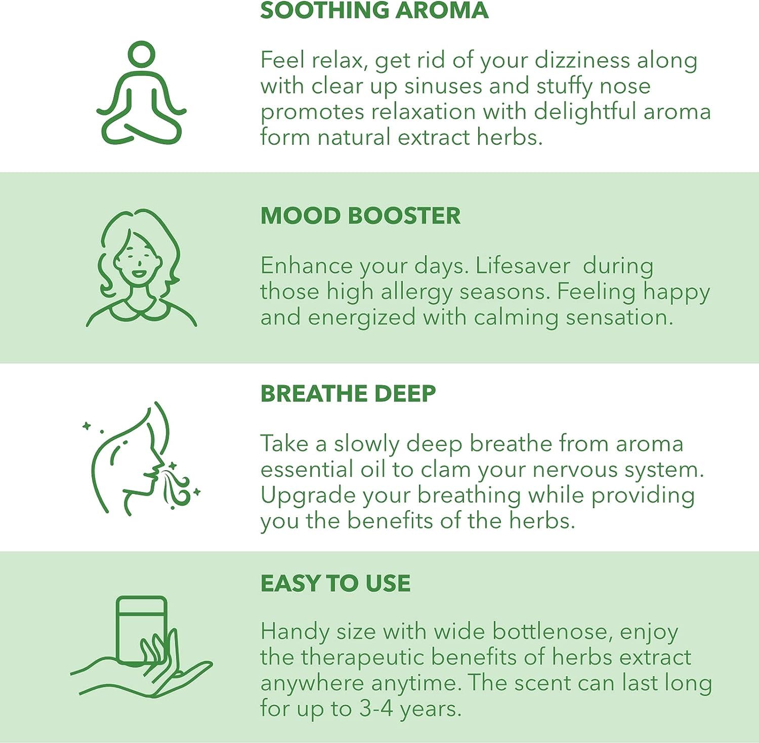 🎯 Versatile for Multiple Uses: Helps with nasal congestion, sinus pressure, headaches, motion sickness, stress relief, and even aromatherapy.